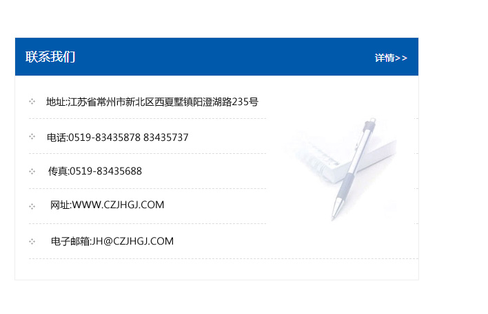 傳真:0519-83435688    郵編:213135    網址:WWW.czjhgj_com.xinchenggonglu.com    電子郵箱:JH@czjhgj_com.xinchenggonglu.com